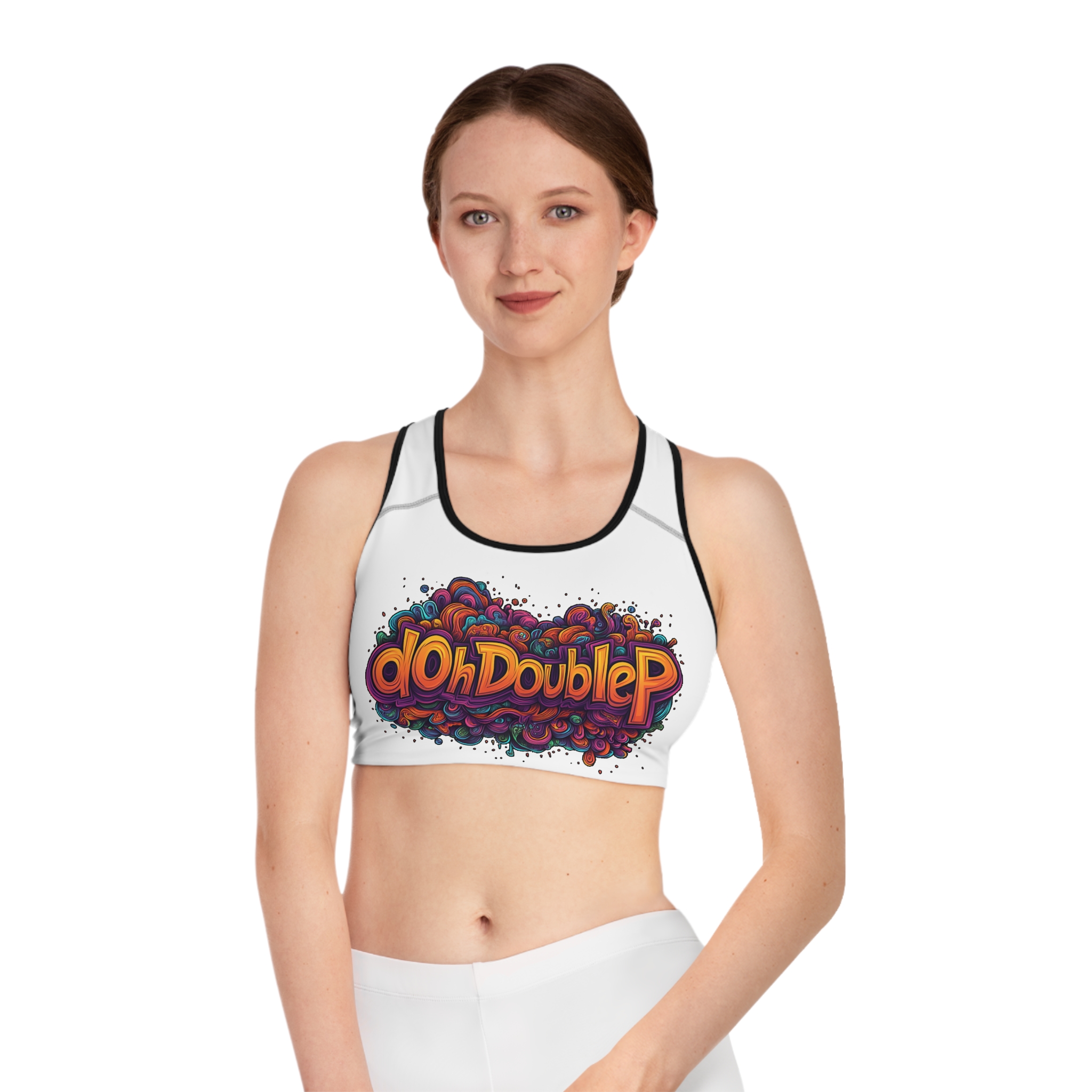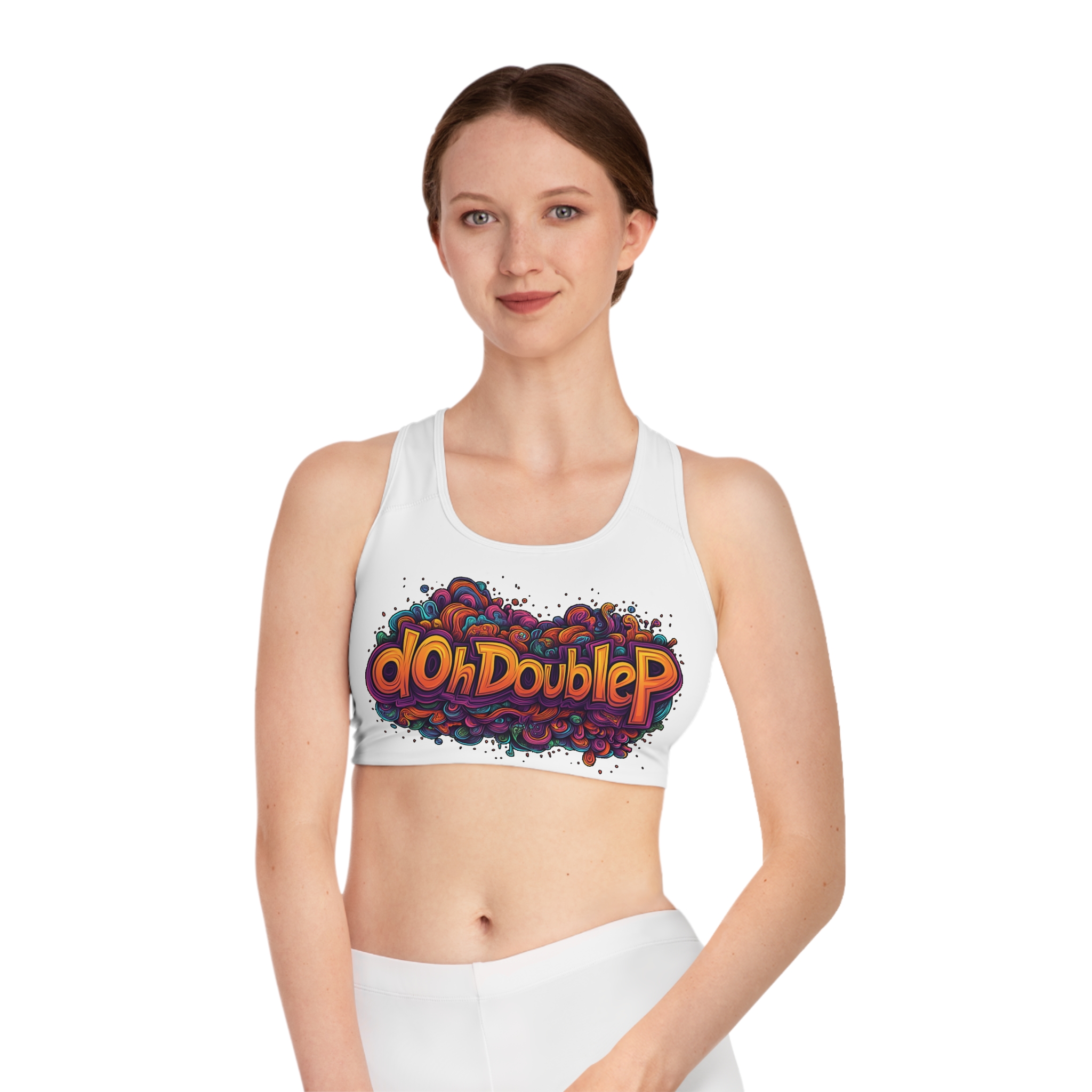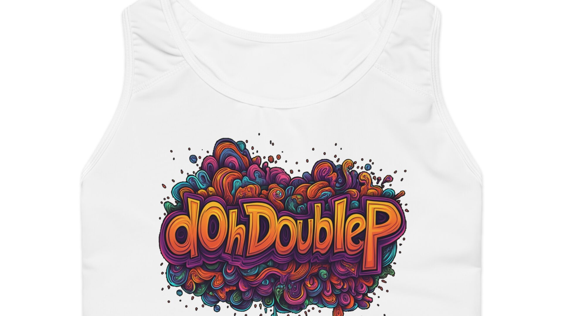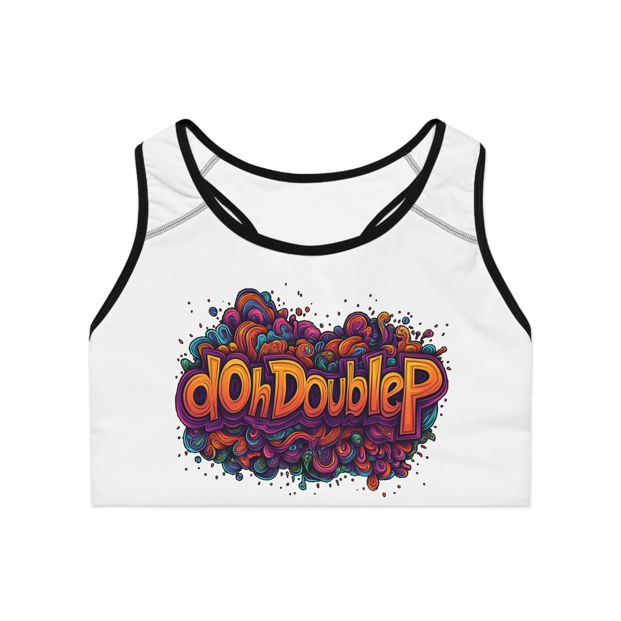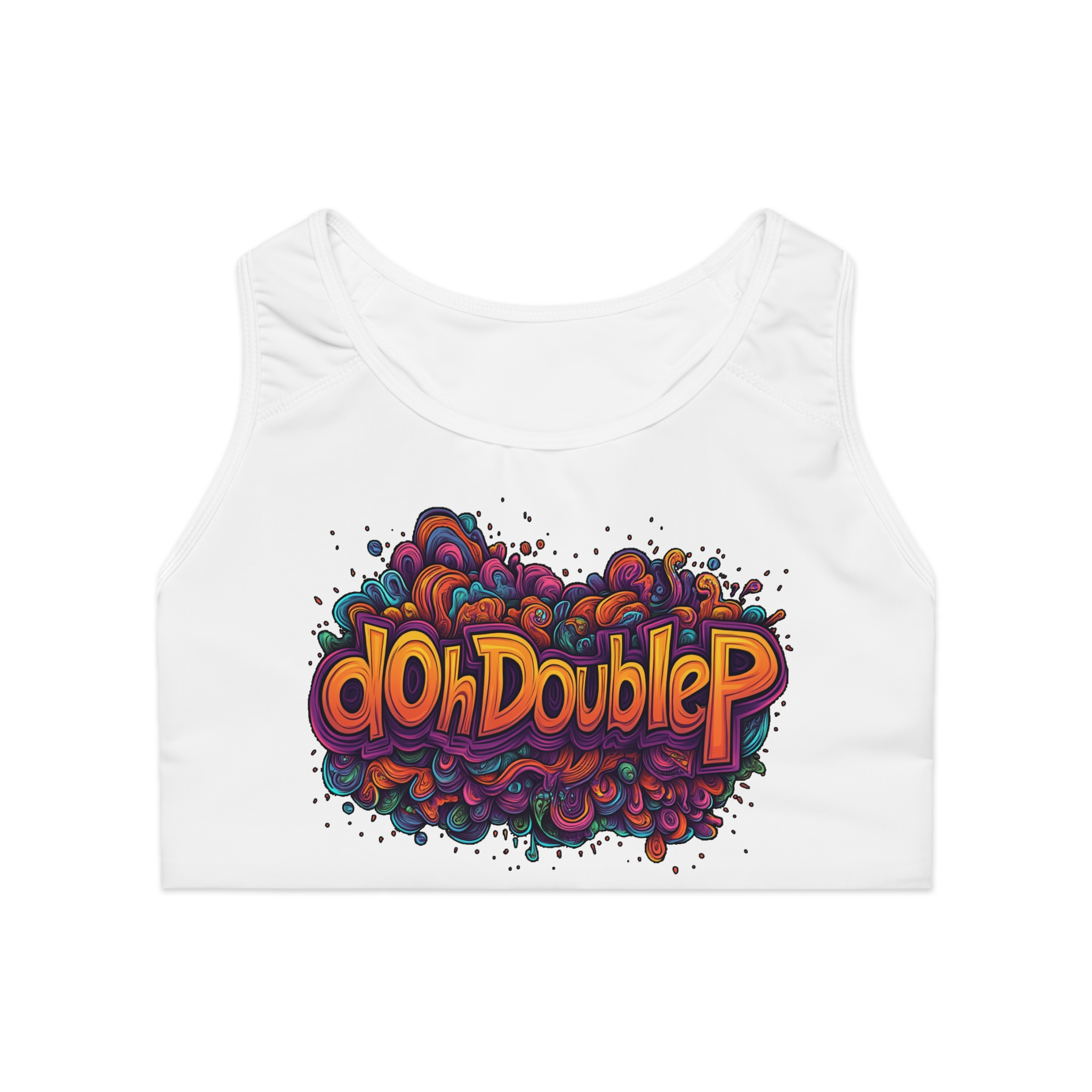 Psychedelic dOhDoubleP Graffiti Logo Graphic Sports Bra — Colorful Retro Gym Crop